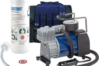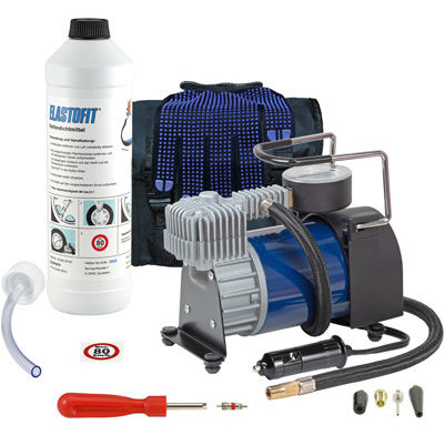 Das clevere Reserverad aus der Flasche für eine sichere Fahrt Das clevere Reserverad aus der Flasche als schneller Reifenpannenhelfer für unterwegs. Das Reifenpannenset ersetzt das konventionelle Reserverad und hat ein geringeres Gewicht sowie weniger Platzbedarf. Bei Reifenpannen wird das ELASTOFIT Reifendichtmittel zur Abdichtung der Reifenverletzung in den Reifen gefüllt und ermöglicht gemäß §36 StVZO als temporärer Notbehelf eine begrenzte Mobilitätssicherung. Für das Einfüllen des ELASTOFIT Reifendichtmittels und die Abdichtung der Reifenverletzung sind keine aufwendigen Montagearbeiten mit Wagenheber oder Radschlüssel erforderlich. Einfach das ELASTOFIT Reifendichtmittel aus der Flasche mit dem beiliegenden Füllschlauch über das Reifenventil in den Reifen füllen, den vorgeschriebenen Reifenluftdruck (=> Fahrzeugherstellerangaben) mit dem beiliegenden Kompressor aufpumpen und die Fahrt mit max. 80 km/h fortsetzen. Die Reifenverletzung sowie jede nachfolgende Verletzung des Reifens wird automatisch abgedichtet. Auch ein Nachfüllpack (Ersatzflasche) ist erhältlich. So kann der Kompressor und das Zubehör auch nach einer Anwendung weiter zur Mobilitätssicherung eingesetzt werden. Reifenpannenset • Das clevere Reserverad aus der Flasche für eine sichere Fahrt. • Qualitativ hochwertige Kompressoren in mehreren Leistungsklassen. • Das Reifendichtmittel hat eine Haltbarkeit von min. 10 Jahren. (Siehe Flaschenaufdruck) • Es ist umweltfreundlich, ohne Lösungsmittel und schädliche Inhaltsstoffe. • Bleibt im Reifen flüssig, verklebt nicht an Reifen, Felgen oder Reifendrucksensoren und greift diese nicht an. • Dichtet Verletzungen bis 8 mm sicher ab. • Auch nachfolgende Verletzungen werden sicher abgedichtet. Unbegrenzte Fahrstrecke bis zur nächsten Werkstatt. • Lässt sich rückstandslos wieder von dem Reifen und der Felge entfernen, so dass aus technischer Sicht eine Reparatur des Reifens möglich ist. Kein Latexprodukt, daher ohne Ammoniak und sensibilisierende Stoffe. Kein Spray oder gefährlicher Inhaltsstoff, daher als ungefährlich eingestuft. Keine gesundheitsgefährdende Bildung von giftigem Aerosol bei der Anwendung. Keine Brandgefahr bei der Anwendung und keine Berstgefahr bei Erwärmung der Flasche im Kofferraum.